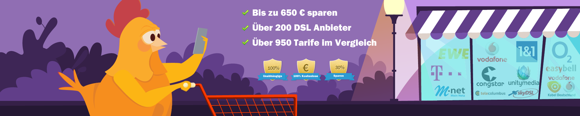 Dslanbieters.com dagegen nutzt eine umfassende Datenbank, in der über 250 einzelne Tarife hinterlegt sind. In diesen Tarifen sind die aktuellen und häufig kompliziert verpackten Vorteile für Neukunden sowie besondere DSL Aktionen bereits berücksichtigt. Unser unabhängiger und seriöser Vergleich enthält fast alle deutschen DSL-Anbieter. Damit finden Sie in viel leichter den für Sie besten Tarif und schöpfen ganz nebenbei ein enormes Sparpotenzial aus. Daher unser Rat: Vergleichen Sie, bevor Sie einen DSL-Vertrag abschließen!